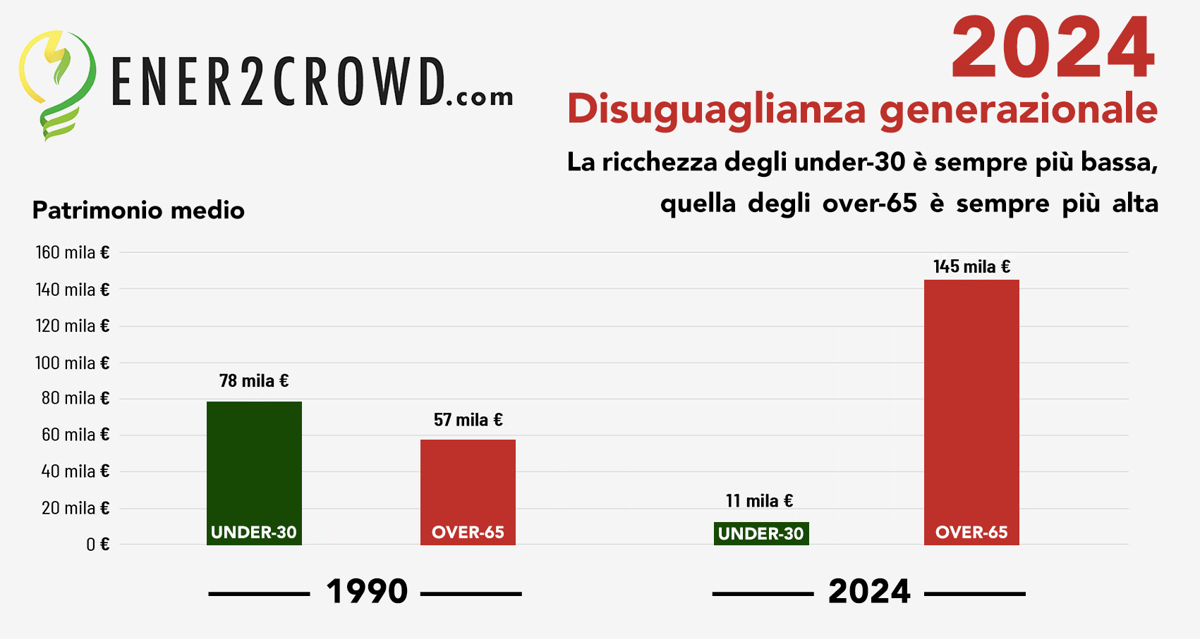 Senza contare poi il problema della disuguaglianza generazionale per cui la ricchezza degli under-30 è sempre più bassa (si passa dai 78 mila euro procapite del 1990 agli 11 mila euro procapite stimati da Ener2Crowd per il 2024) mentre quella degli over-65 è sempre più alta (dai 57 mila euro procapite del 1990 ai 145 mila euro procapite stimati per il 2024).